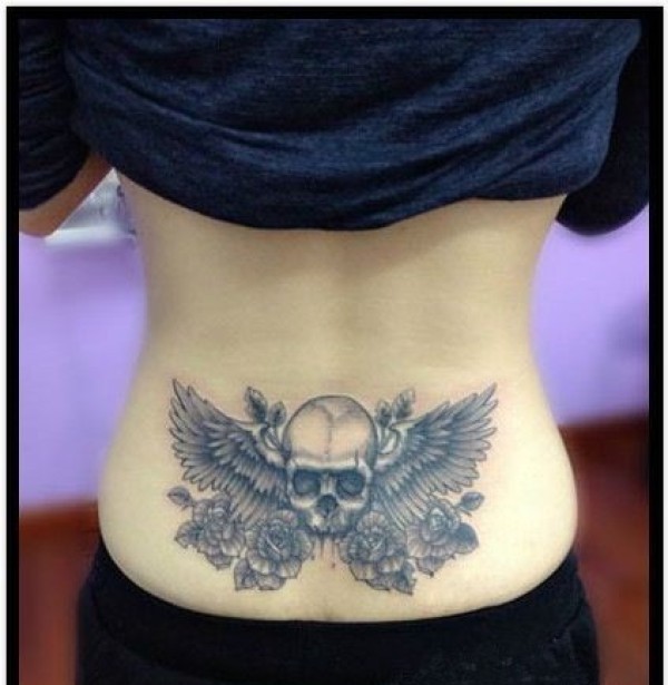 女生后腰纹身黑白灰风格抽象线条纹身图案