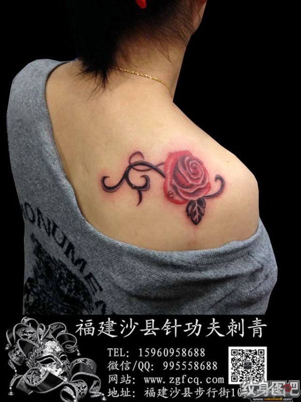 福建针功夫纹身--肩膀玫瑰花纹身作品