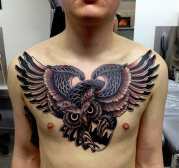 男士胸前潮流时尚的猫头鹰纹身