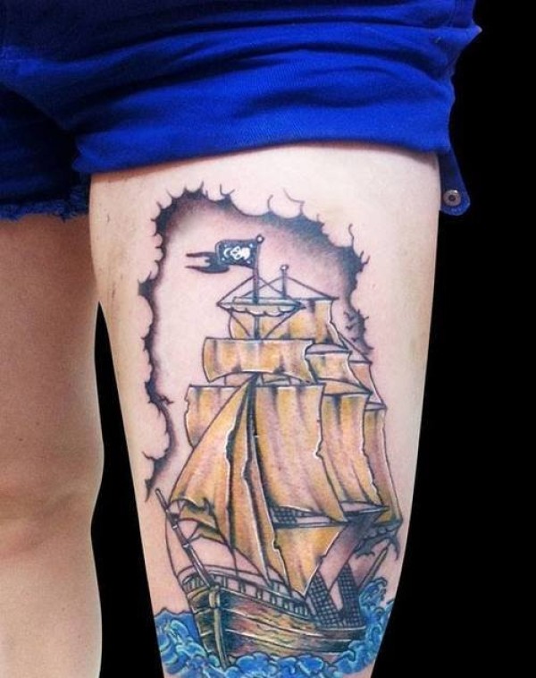个性的腿部帆船纹身