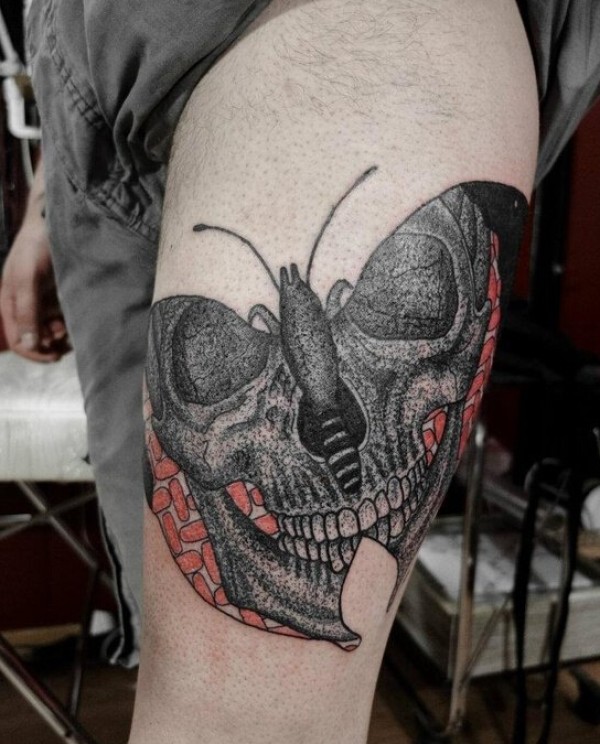 欧美男大腿个性骷髅蝴蝶纹身