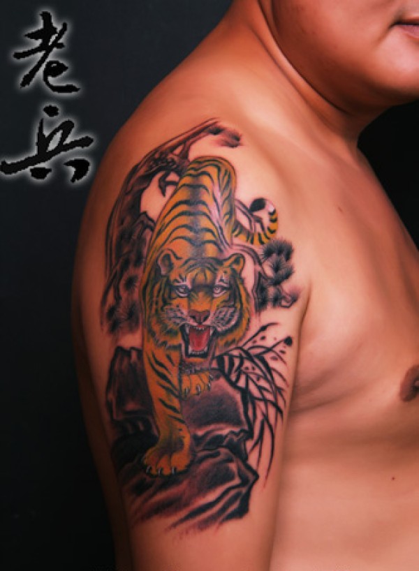 经典的大臂下山虎纹身