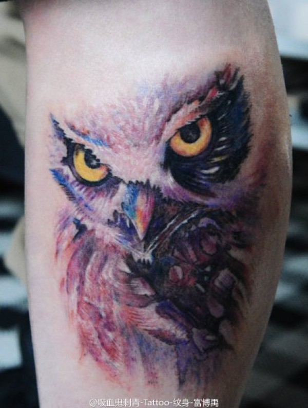 小腿上的水彩猫头鹰纹身