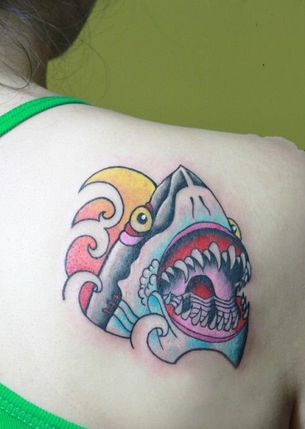 女生后背卡通鲨鱼头纹身
