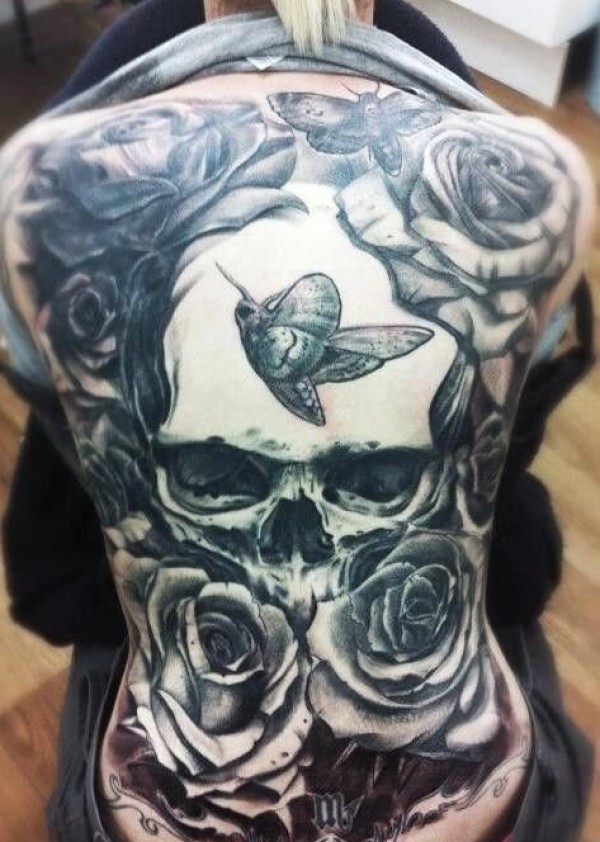 女生满背玫瑰骷髅飞蛾纹身