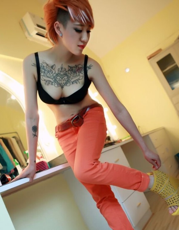 潮人美女生感胸前玫瑰心纹身
