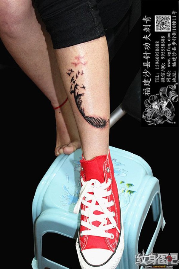 福建纹身-针功夫纹身作品--小腿羽毛纹身