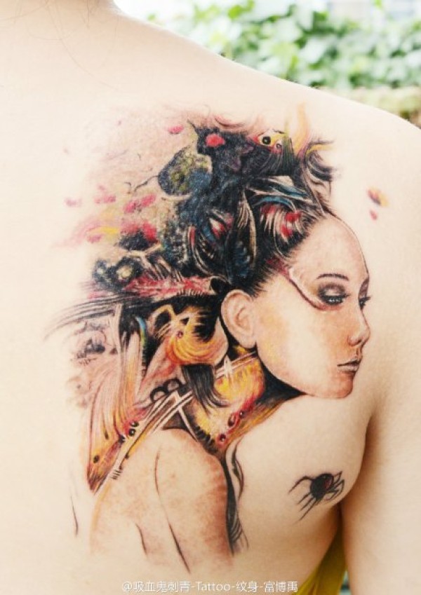 性感女生满背创意文身作品