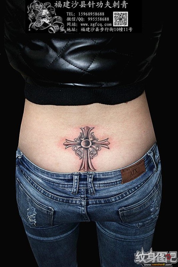女生后腰纹身黑白灰风格抽象线条纹身图案