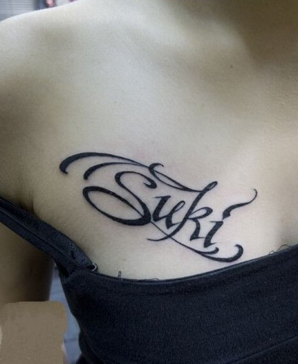 美女时尚的胸前花体英文字纹身