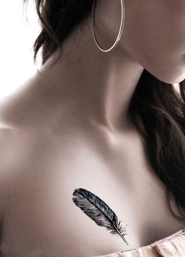 美女胸前简单的羽毛纹身