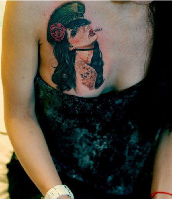 美女胸前个性抽烟女头像纹身
