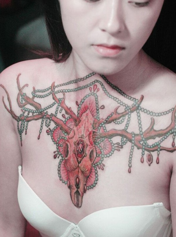 美女霸气骷髅鹿头胸前纹身