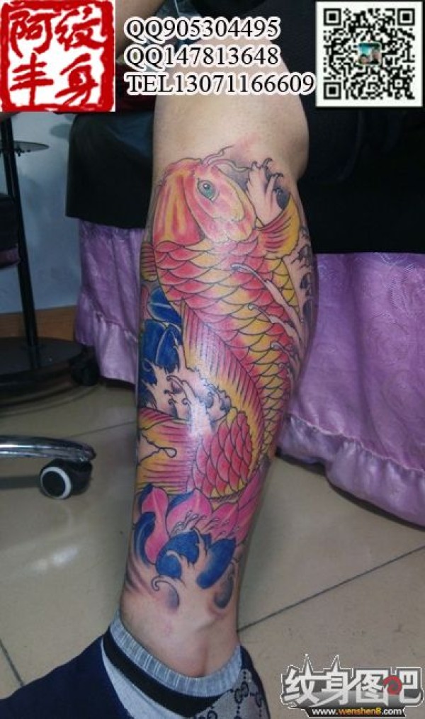 传统鲤鱼花小腿纹身_腿部纹身图案大全_纹身图吧