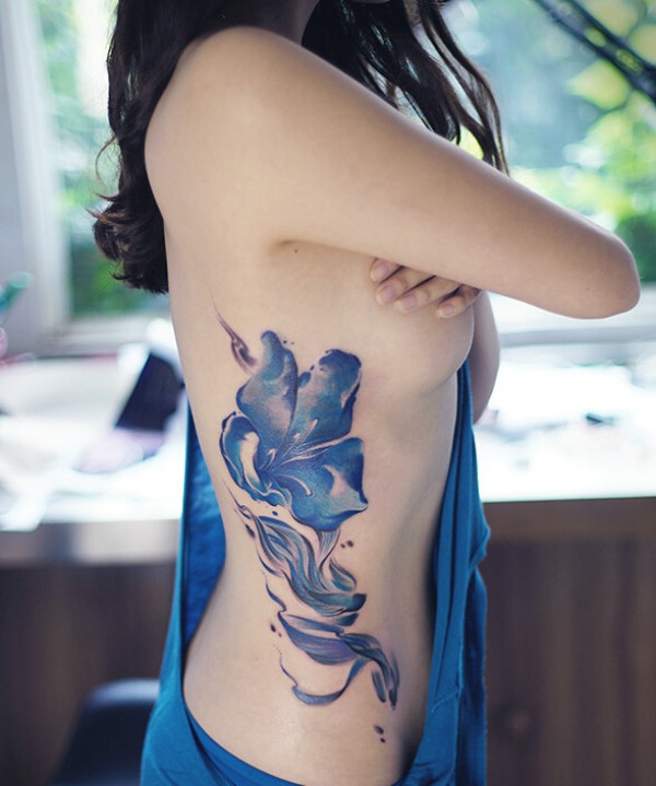 性感美女侧腰水彩茶花纹身图案