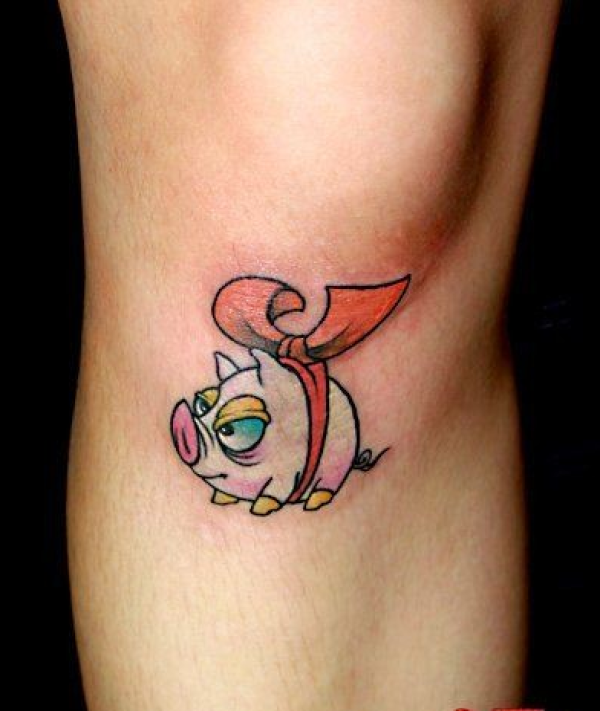膝盖下可爱的萌猪纹身图案