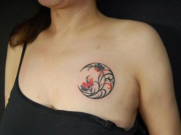 女生胸前月亮线条花图腾纹身