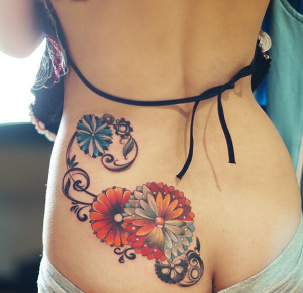 女生腰上彩色花纹身图案