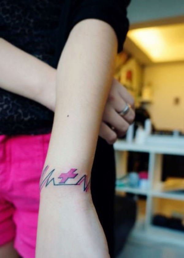 美女手腕个性十字架和心电图纹身