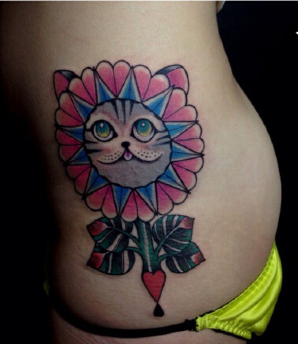 女生腰臀部可爱的向日葵猫咪纹身