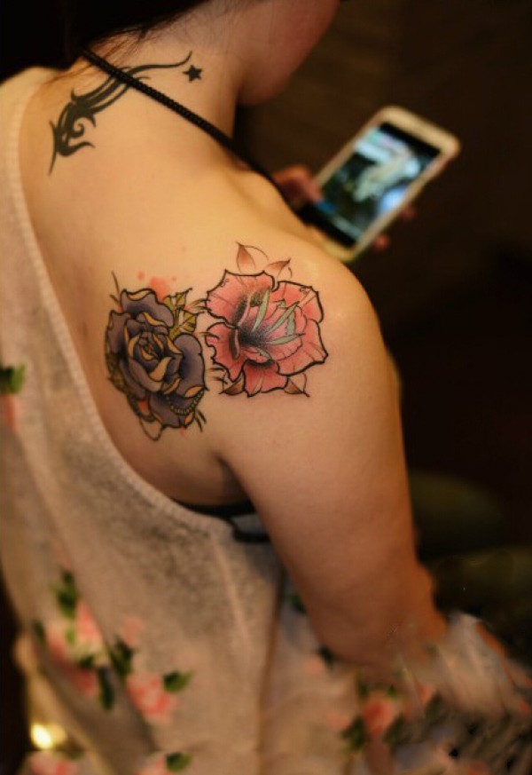 时尚美女玫瑰花肩部纹身