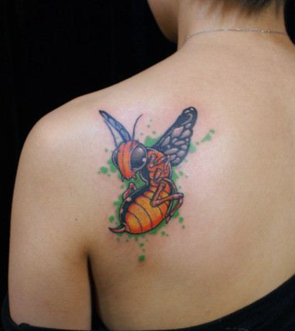 女生背部经典的小马蜂纹身