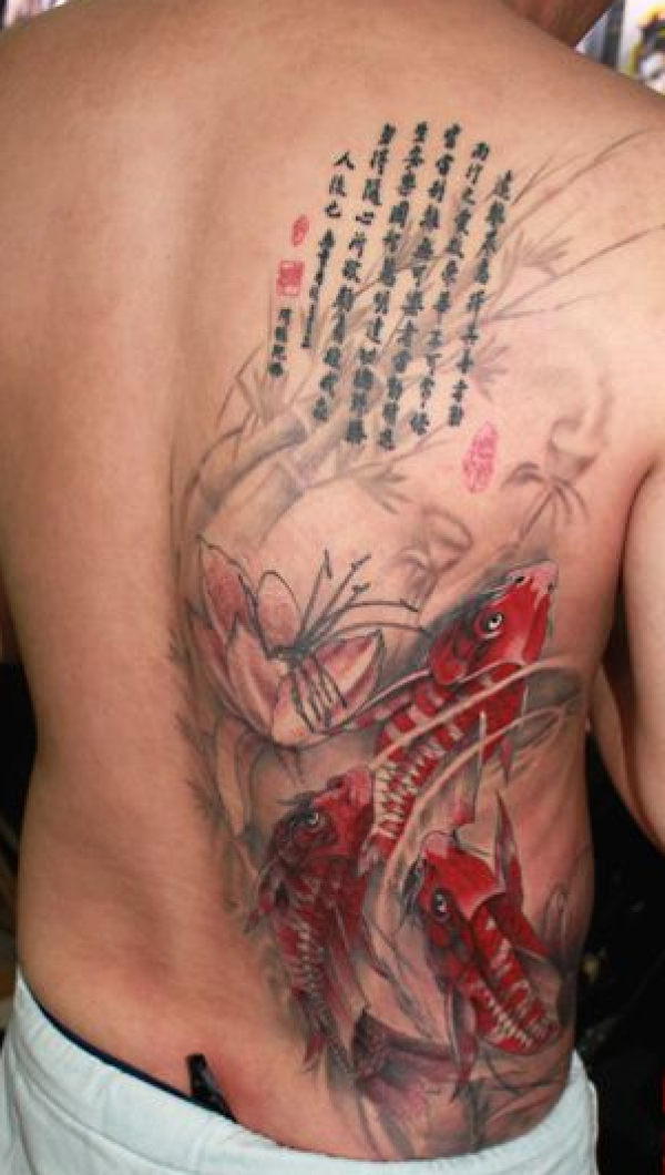 男士后背唯美的水墨鲤鱼纹身