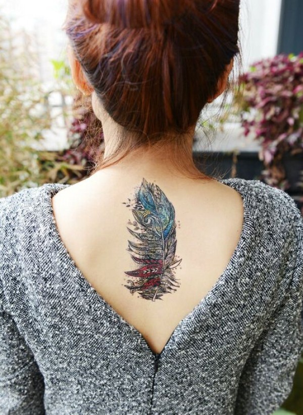 美女后背精美羽毛时尚纹身图案