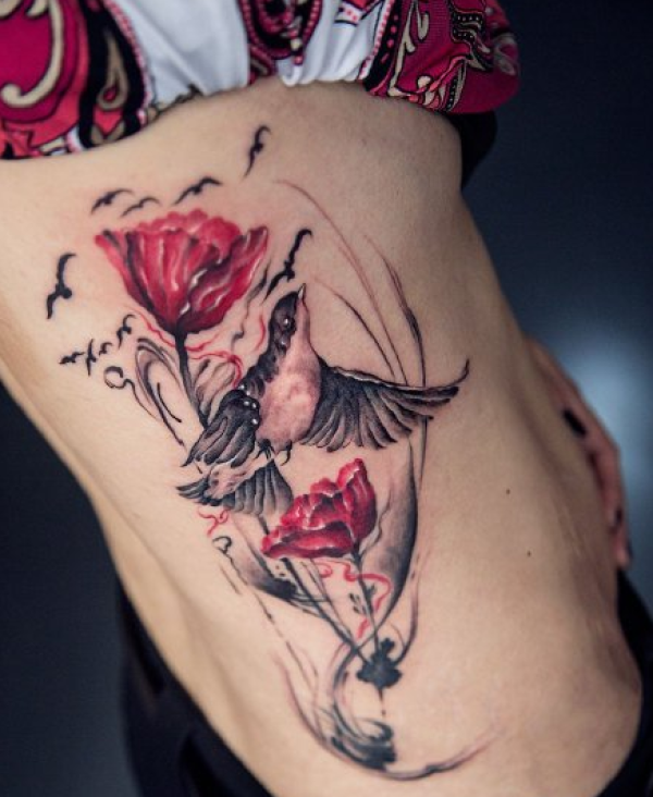 水墨黄鹂鸟莲花纹身图案
