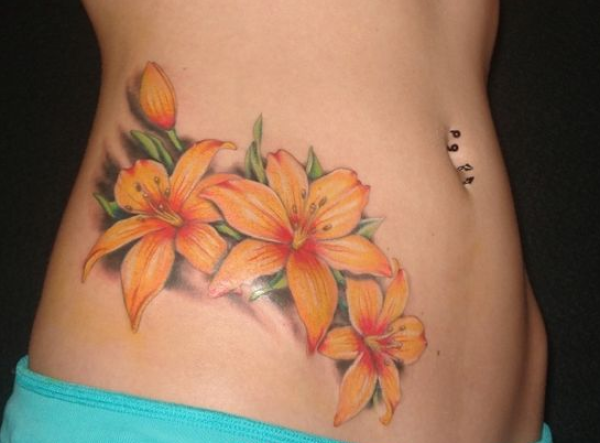 美女腹部彩色百合花纹身图案