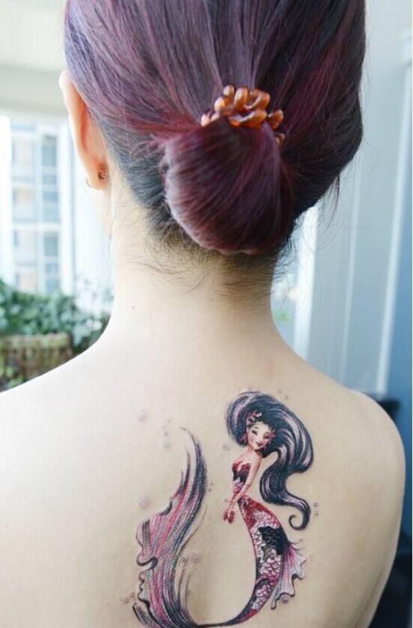 女性背部彩色美人鱼文身图片