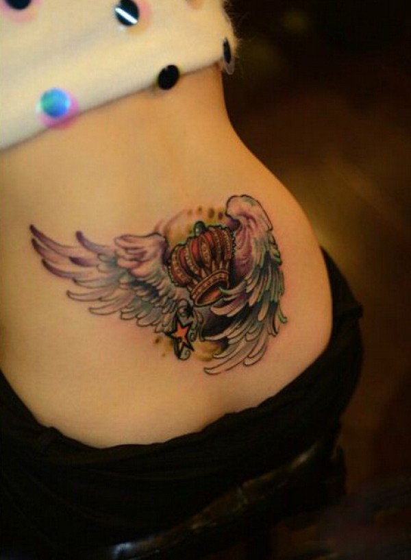个性后腰翅膀皇冠纹身图案
