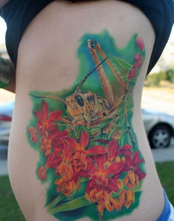 美女侧腰漂亮的上彩色蚱蜢纹身