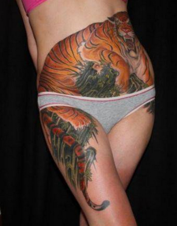 美女腹部猛虎下山纹身图案