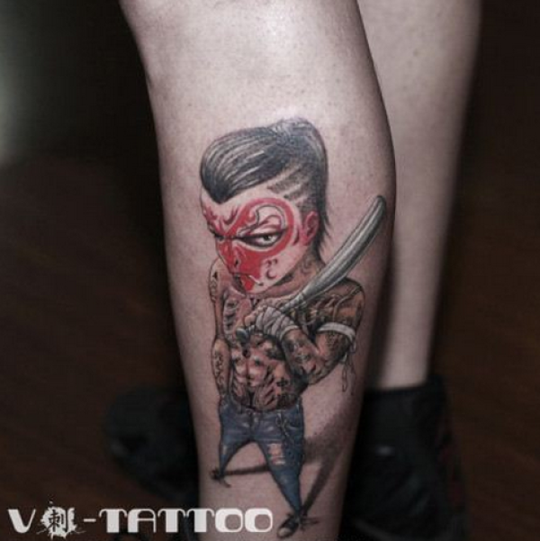 腿部拿着棒球棍的肌肉孙悟空纹身