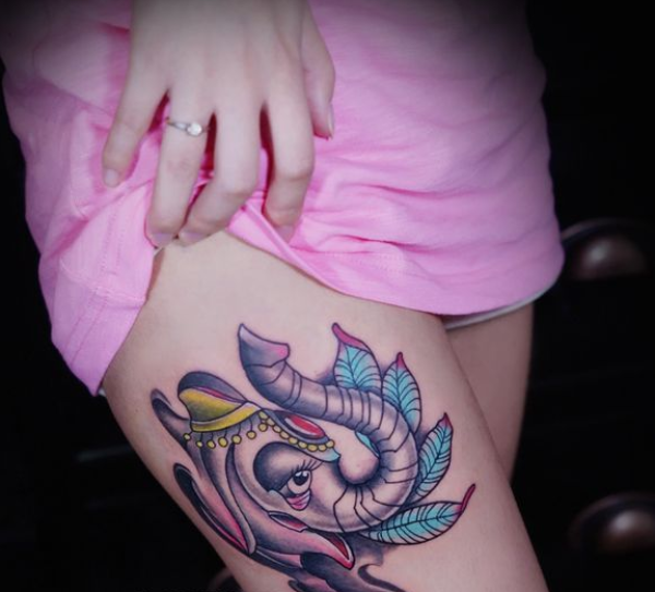 女生大腿上个性象神纹身