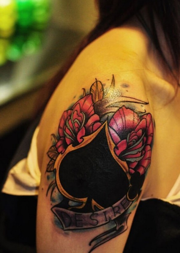 胳膊黑桃心玫瑰花字母飘带纹身图案