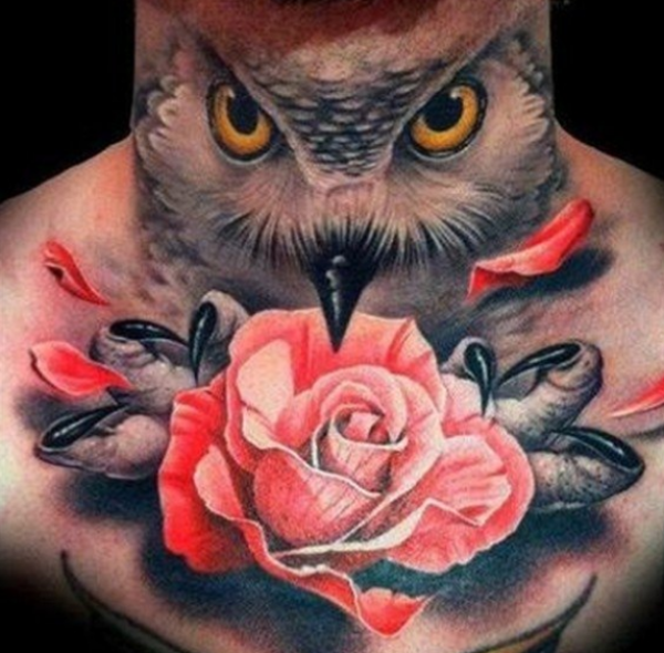 颈部猫头鹰和玫瑰纹身