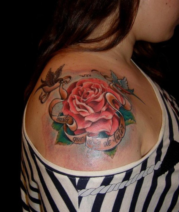 肩部彩色玫瑰小燕子纹身图案