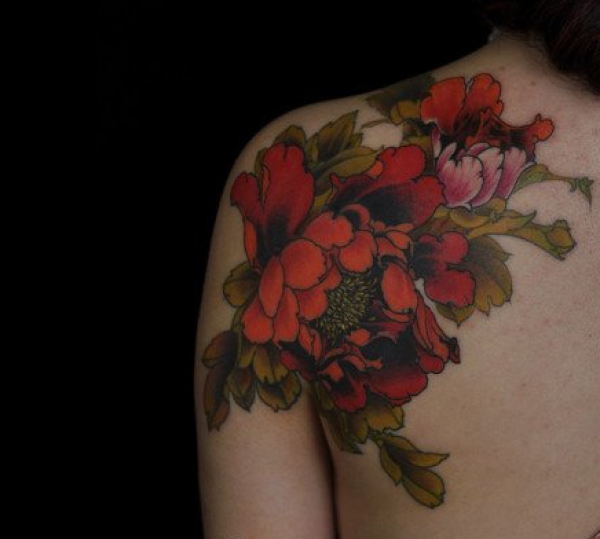 女性肩背唯美潮流的传统牡丹花纹身图案