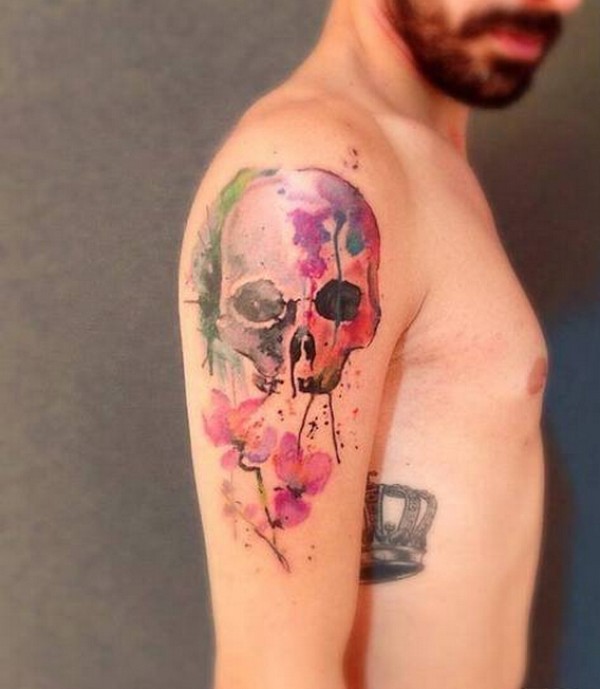 手臂彩色泼墨骷髅纹身图案