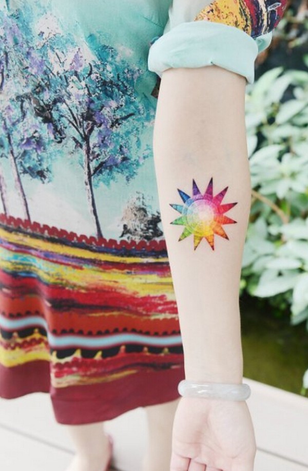 女生手臂彩色太阳纹身