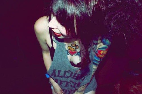 美女胸前心形和花臂纹身