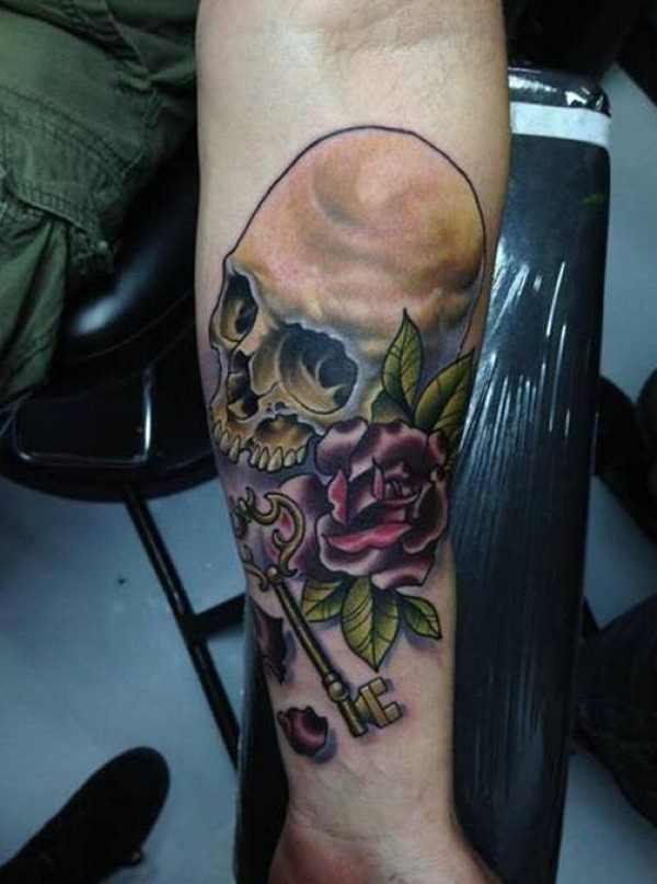 手臂骷髅玫瑰花钥匙纹身图案