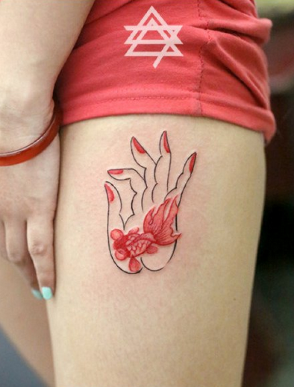 美女腿漂亮的佛手与小金鱼纹身图案