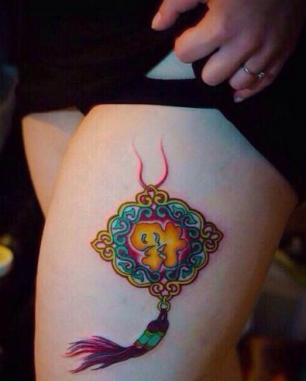女生腿部彩色福袋纹身图片