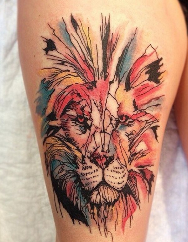 大腿上水墨狮子纹身图案