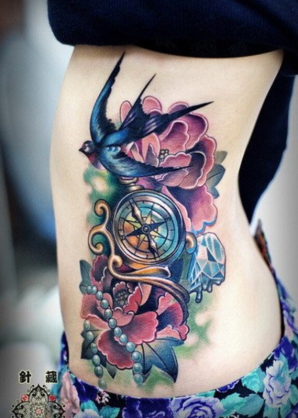 女生腰部彩色燕子指南针牡丹花纹身图案