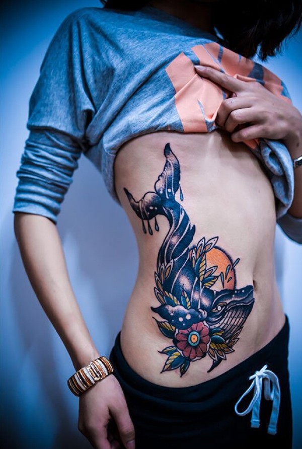 女生腰部宝蓝色灵动鲸鱼纹身图案