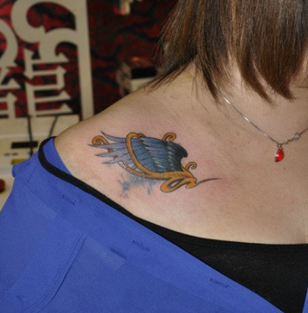 女生肩膀处小巧潮流的翅膀纹身图案
